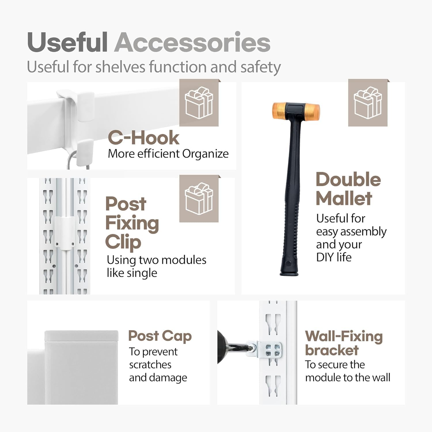 - You don't need any tools for assembly. Just slide and fix the frame in the post hole by lightly pressing it with your hands. However, a rubber mallet is provided considering your convenience when dismantling the shelf.