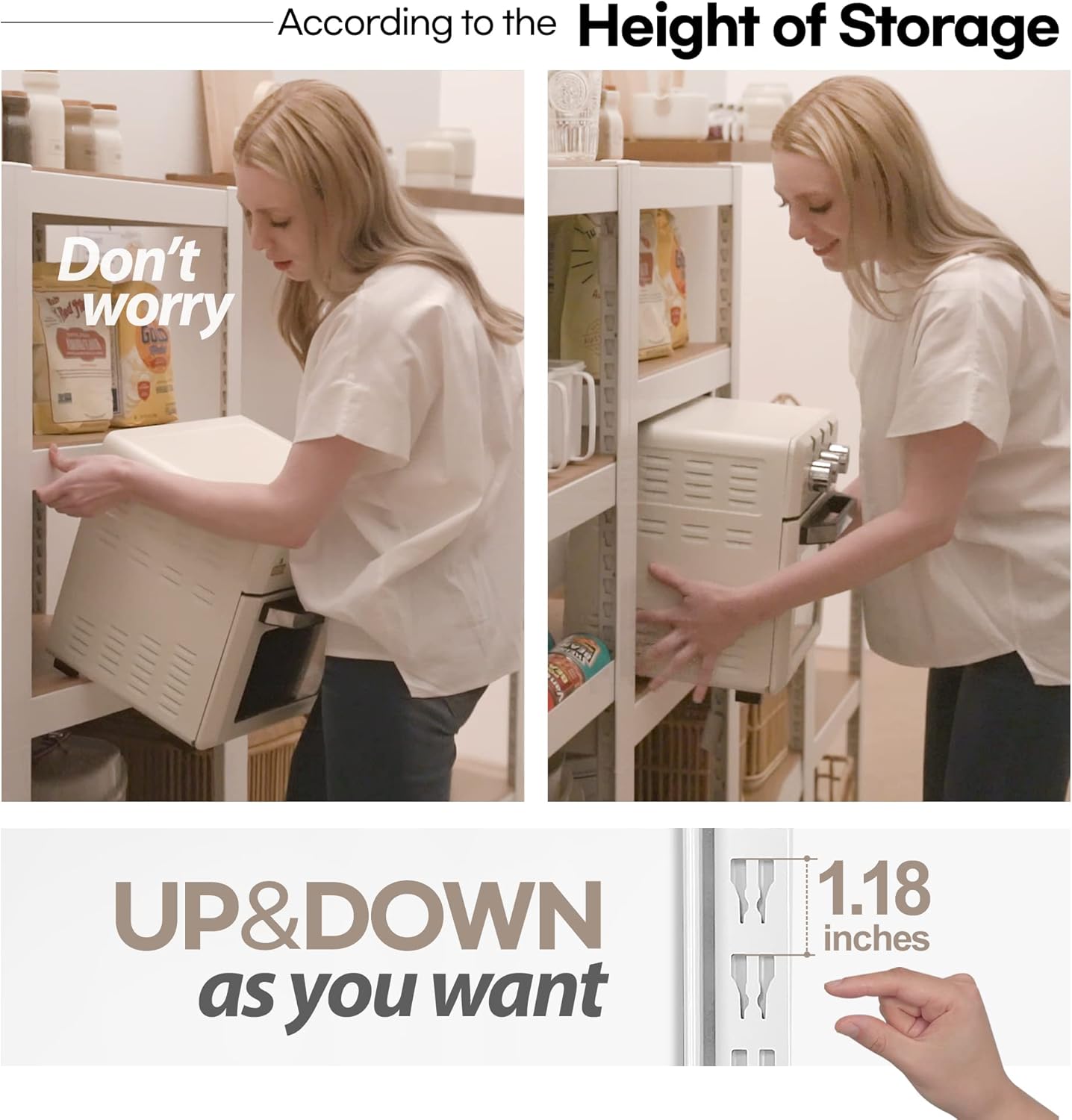 - Each tier can be freely adjusted the shelf up and down by the size of the item, as the hidden secret holes inside the post have grooves 1.18 inches apart. So can create customized storage space.