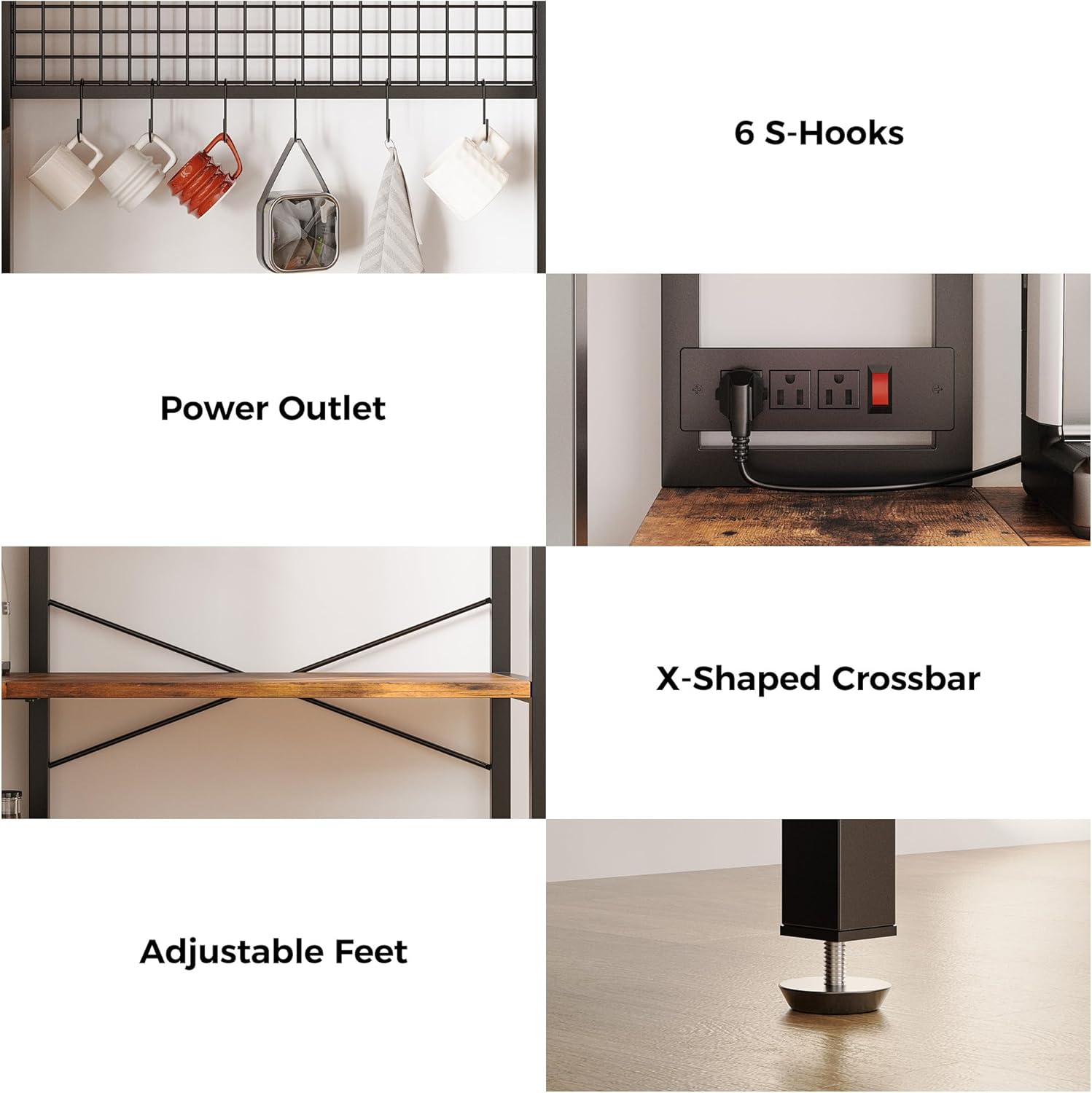 IRONCK Bakers Rack with Power Outlet, 5-Tier Corner Microwave Stand with Storage, Coffee Bar with 6 S-Shaped Hooks, Kitchen Shelves with Wire Basket