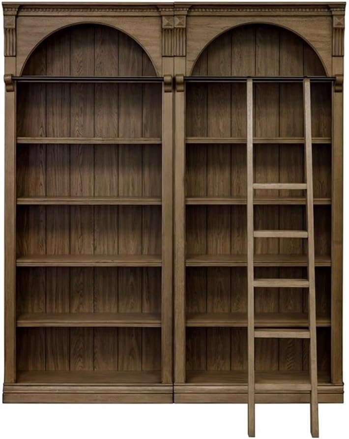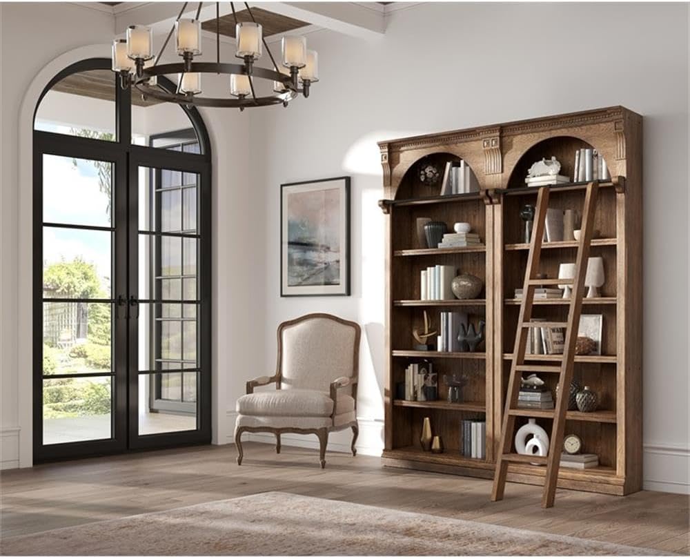 Stratton emulates the grand scale and timeless beauty of a gothic library. Distinguishing details include elegant arches, fluted corbels, dentil molding, and bead board back panels. Hardwood veneers have been wire brushed and intentionally distressed to present an authentic aged appearance and are enhanced by the rich toffee finish. The five step wooden ladder can be hung on metal bars for an added touch of nostalgia.