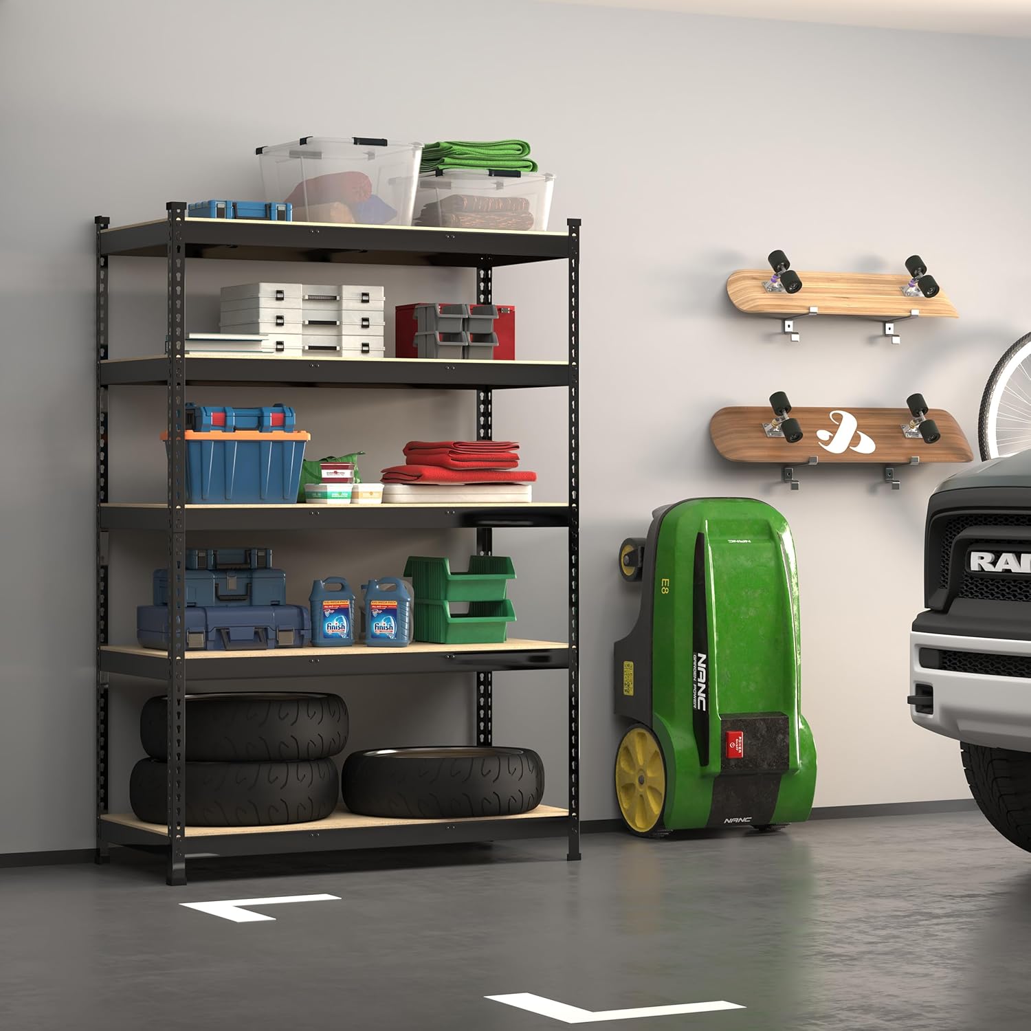 The 5-tier garage storage shelves is constructed from high-quality thick MDF boards and a heavy-duty metal frame with a premium powder-coated finish surface.
