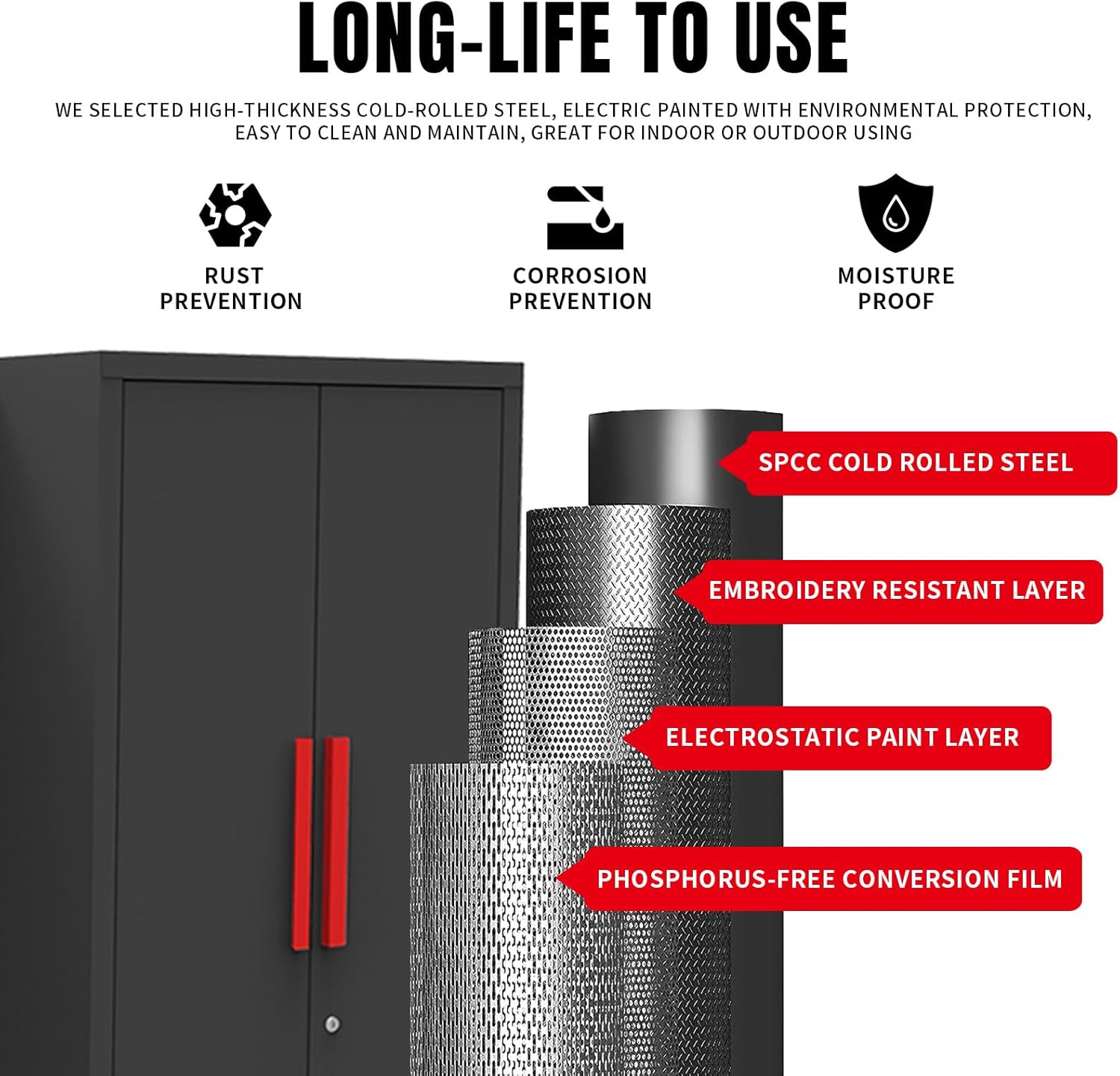 The size of garage storage cabinet set are 130"L x19"Dx 76"H inches. Locker x2, Wall cabinet x2, 1-drawer roller cabinet x2, 4-drawer roller cabinet x1, 71 in workbench x1, Pegboard x10, Shelf to connect the wall cabinets x4. For stability, high cabinet s can optionally be fixed to the wall. Overall weight capability : Locker 820 lbs., Wall cabinet 50 lbs., 1-drawer roller cabinet 620 lbs., 4-drawer roller cabinet 380 lbs., 52in workbench 800 lbs. The locker can also be used with a pegboard for hanging a variety of small items and tools. Its versatile metal pegboard adapts to different sizes and specifications of hooks, organizers and accessories to organize tools and clutter in garages, sheds, workshops and more. The pegboards feature a durable powder-coated finish that prevents rusting and cracking. The metal pegboard is stronger and more durable than traditional pegboards. Overall, this storage cabinet features sturdy construction, strong weight capacity, easy to move and assemble. It can meet the storage needs of different occasions and is suitable for garages, offices, factories, warehouses and other places. Meanwhile, its details are well handled, such as the use of high-quality materials, coating treatment, adjustable design, and so on. Whether you need a cabinets for easy mobility, a closet for storing tools or a cabinet for storing office files, this storage cabinet can meet your needs.