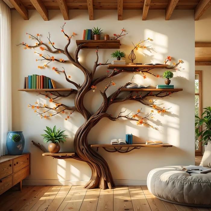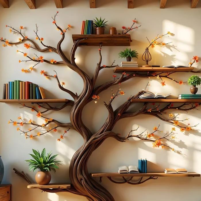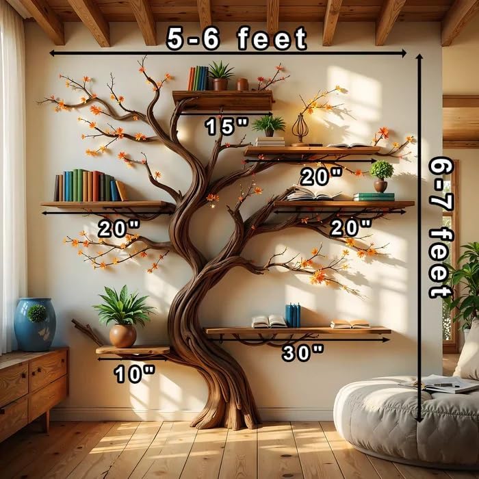 Transform your living space with this magnificent tree branch bookshelf, a stunning fusion of functional storage and artistic design. Standing 7 feet tall and spanning 6 feet wide, this wall-mounted masterpiece features six uniquely positioned shelves that follow the natural flow of tree branches. The varying shelf depths (ranging from 10 to 30 inches) provide versatile storage options for books, decorative items, and cherished collectibles. The brown-finished structure creates a captivating focal point, enhanced by delicate LED lights that illuminate the branches and create a warm, enchanting ambiance. The shelves are thoughtfully arranged at different heights, with the lowest shelf positioned perfectly for easy access and the upper shelves creating an eye-catching display reaching toward the ceiling. This statement piece seamlessly combines practical storage with sculptural beauty, making it ideal for living rooms, reading nooks, or office spaces. The sturdy construction ensures stability while maintaining the organic, flowing aesthetic of a natural tree. Each shelf is carefully crafted to support your books and decorative items while maintaining the artistic integrity of the design.
